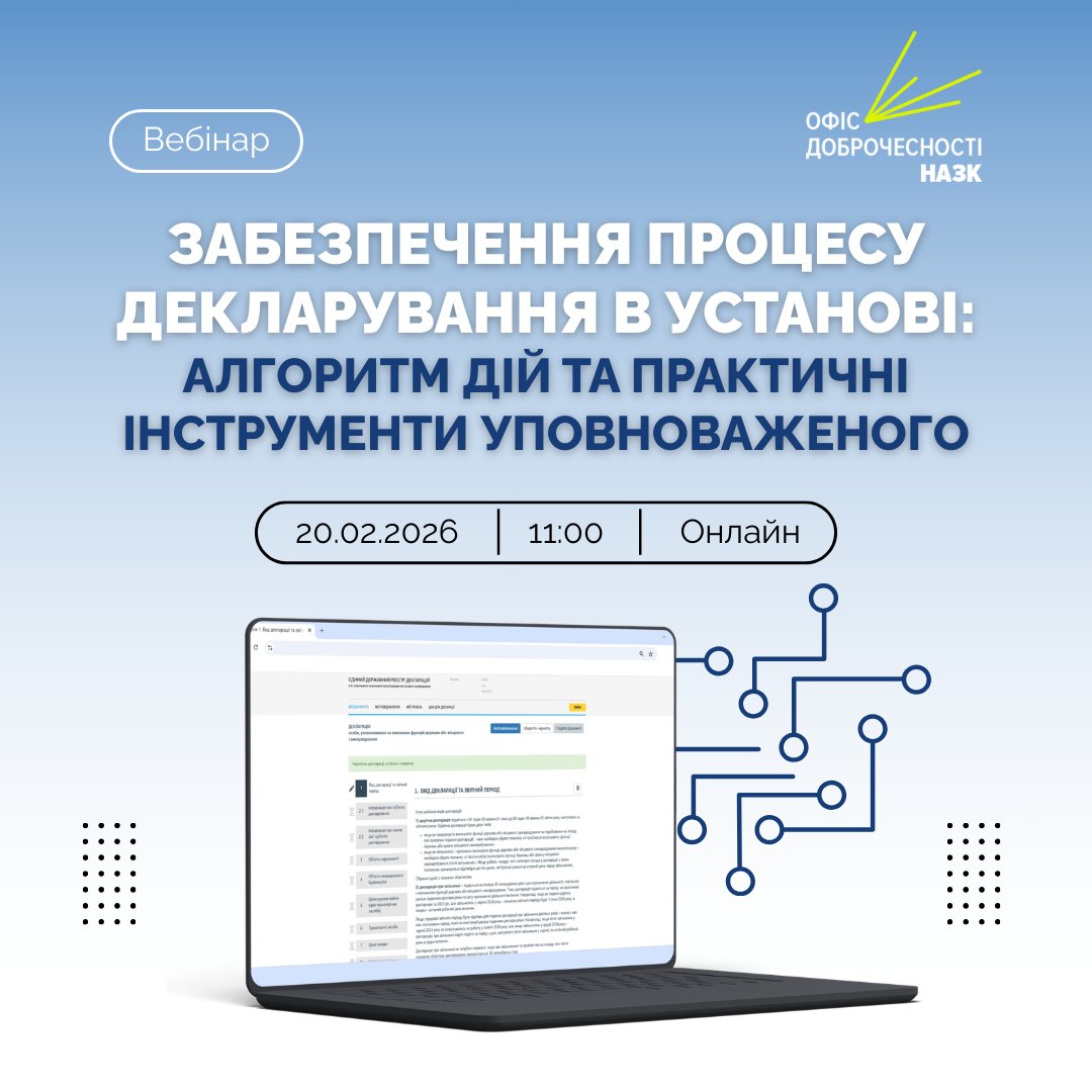 20 лютого 2026 року уповноважена особа з питань запобігання та виявлення корупції НДІ мікрографії взяла онлайн-участь у вебінарі на тему: ««Забезпечення процесу декларування в установі: алгоритм дій та практичні інструменти уповноваженого».