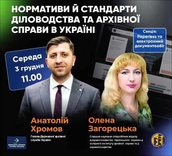 Олена Загорецька, старший науковий співробітник відділу документознавства Українського науково-дослідного інституту архівної справи та документознавства, провела лекцію, в якій зробила огляд ключових нормативно-правових актів і національних стандартів, що регламентують створення, облік, зберігання та передавання паперових і електронних документів в Україні.